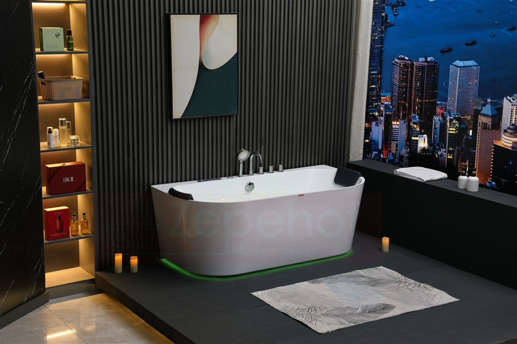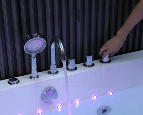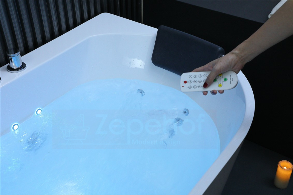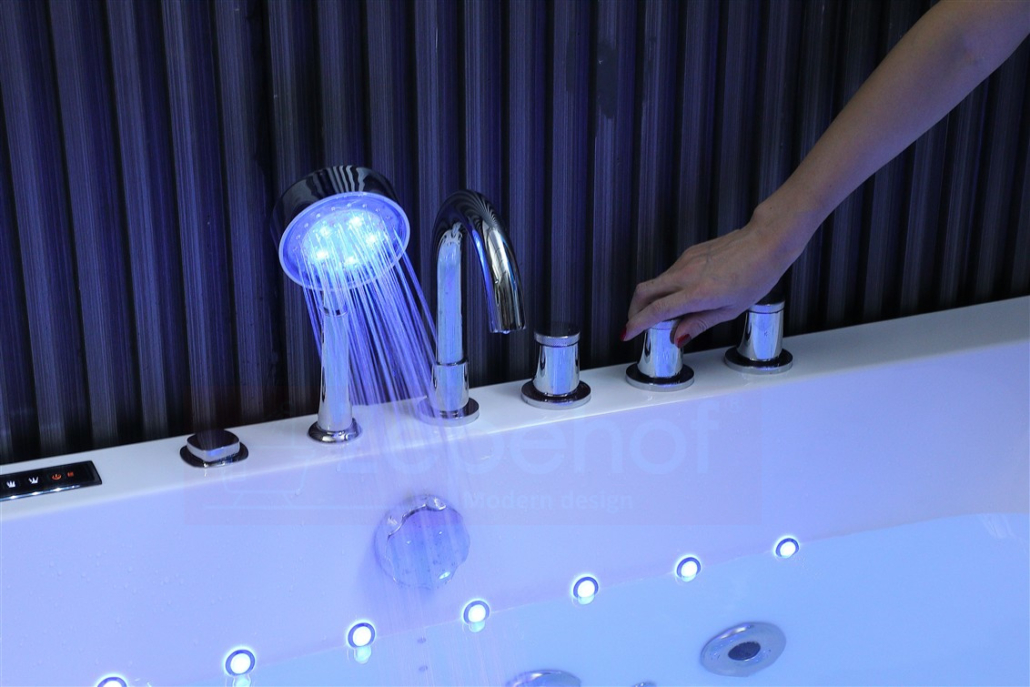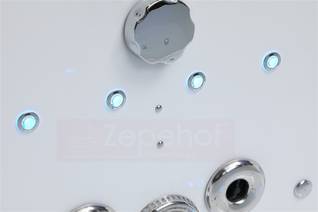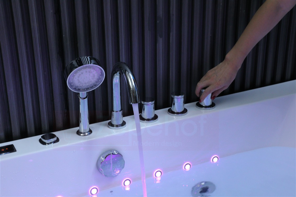 Funktionsbeschreibung: Luft-Effekt-Wassermassage (42 LED-Düsen für Luftmassage im Boden der Badewanne), 400 W Luftpumpe (TÜV, CE-Zertifikat) Wassererhitzer 1500W (Die Präsentation der Farbtherapie in Kombination mit der Massage ist auf den Beispielfotos und im Film you tube zu sehen.) Die Farbtherapie kann unter anderem die konventionelle Behandlung unterstützen von depressiven Zuständen. Ablassschraube mit Mechanismus in der Badewannenwand + Ablassschlauch