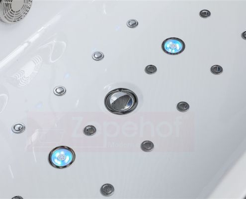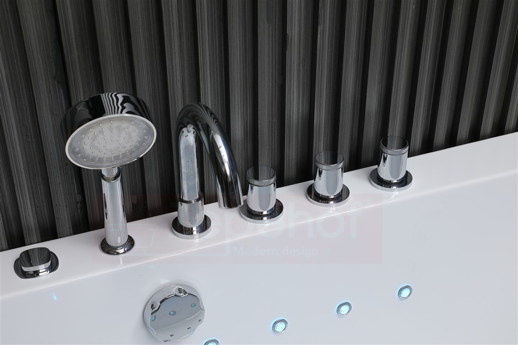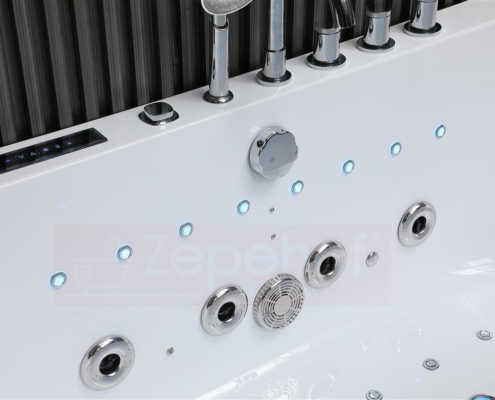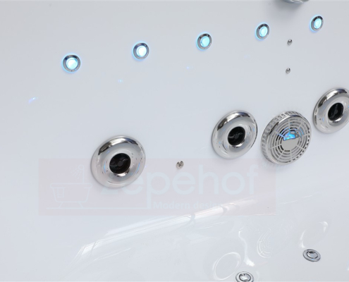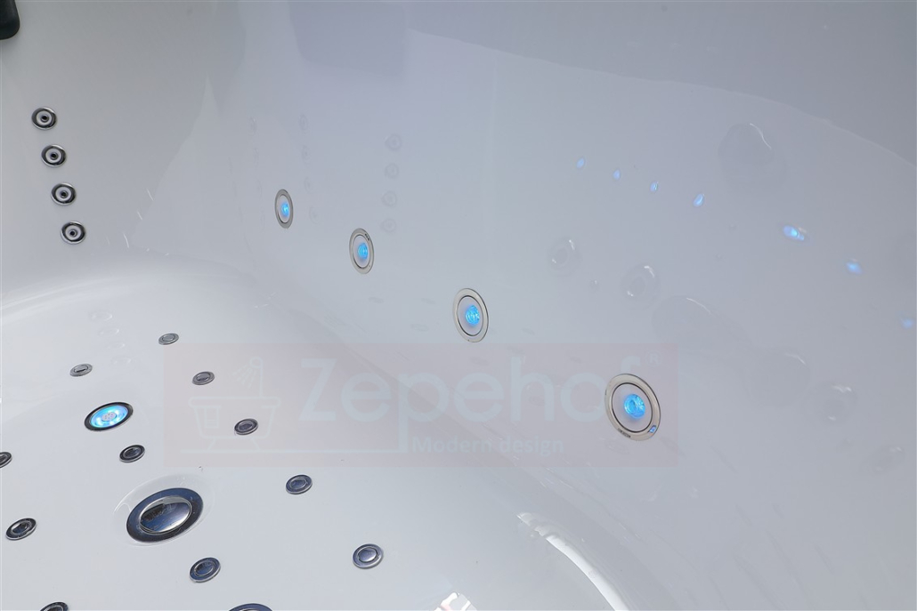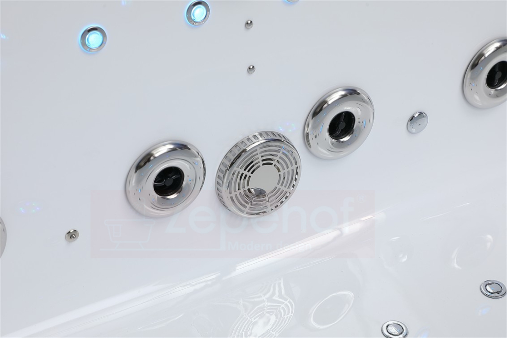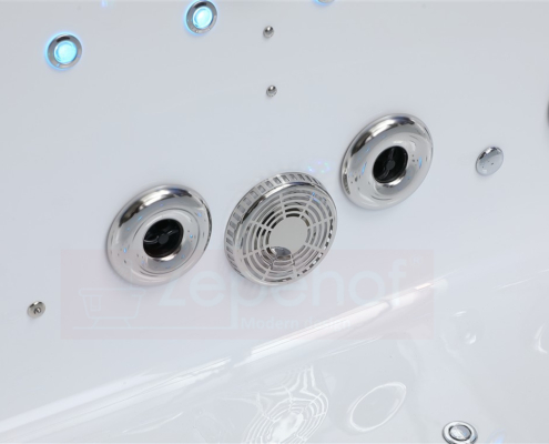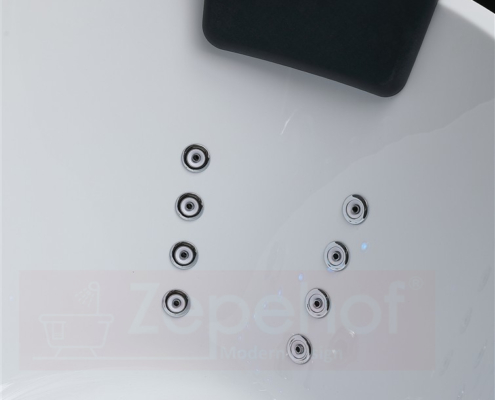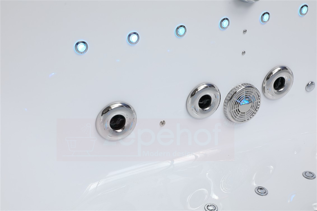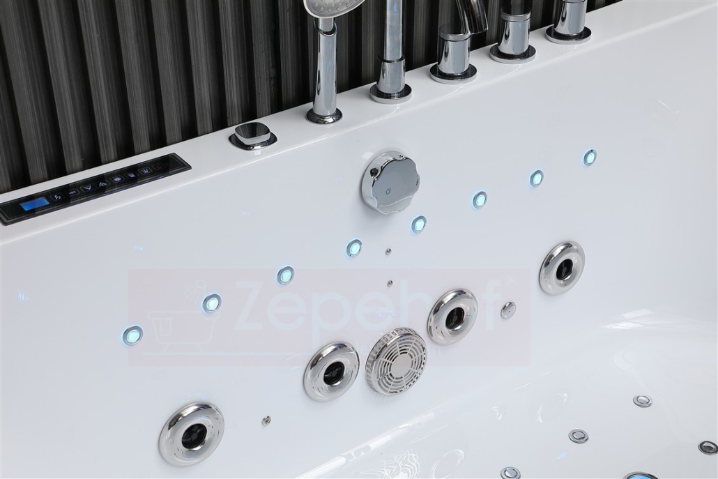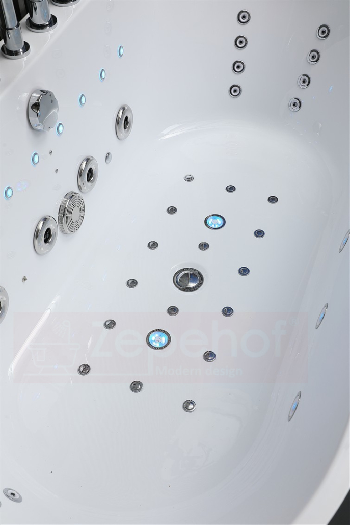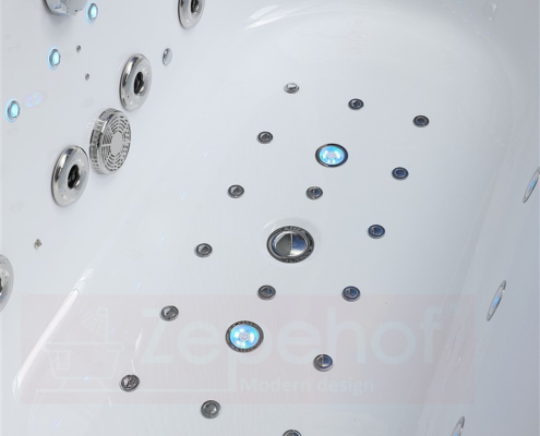 Wassermassage (4+4 große Düsen in der Badewannenwand, 16 kleine Düsen für die Rückenmassage auf jeder Seite, Insgesamt 24 Stück), Wasserpumpe mit einer Frequenzweiche von 1,5 PS (TÜV, CE-Zertifikat)