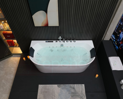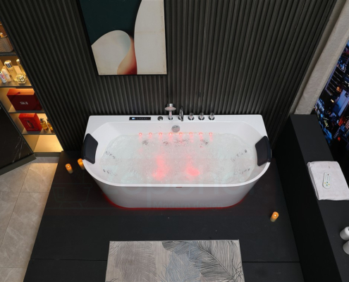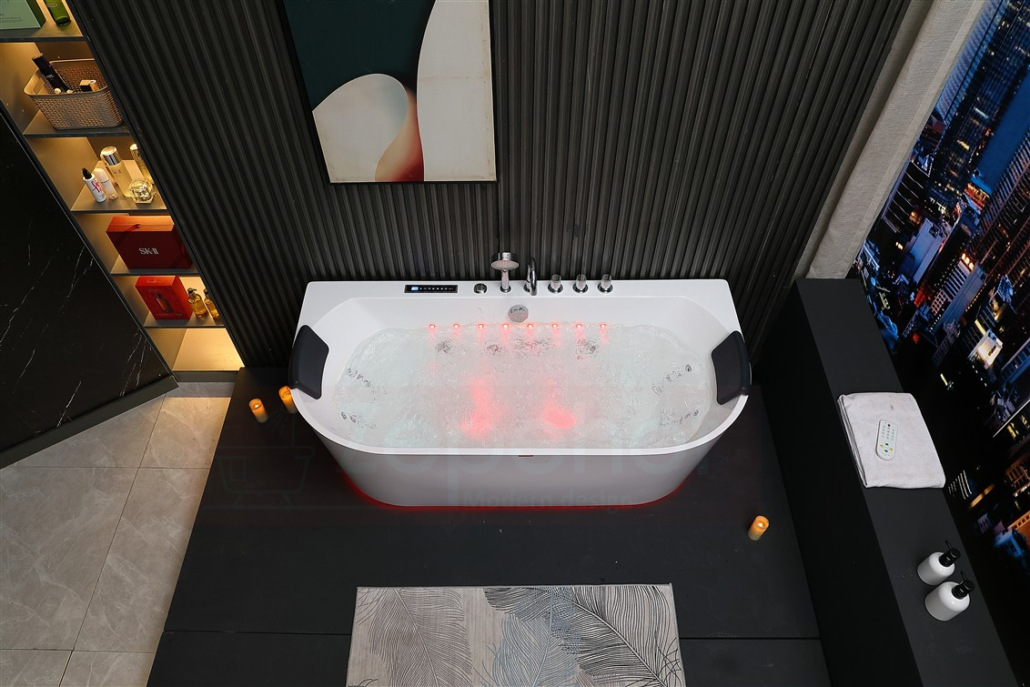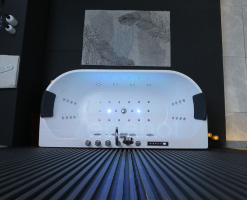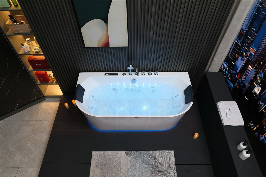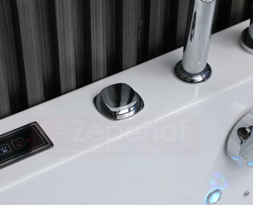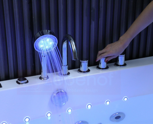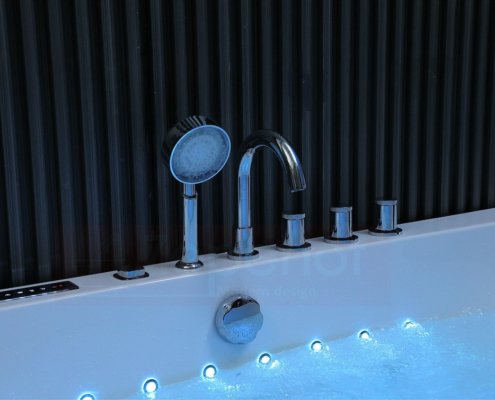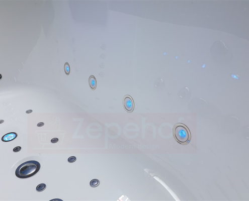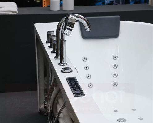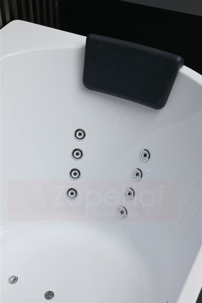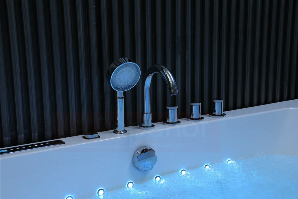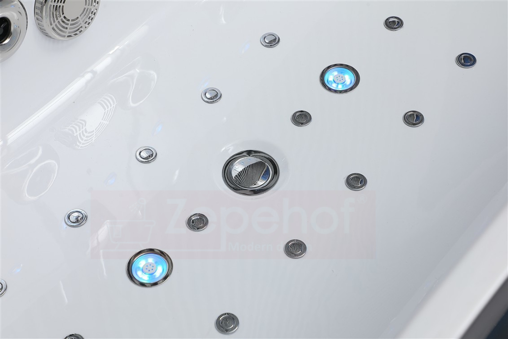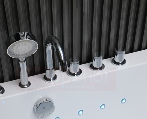 Wassermassage (4+4 große Düsen in der Badewannenwand, 16 kleine Düsen für die Rückenmassage auf jeder Seite, Insgesamt 24 Stück), Wasserpumpe mit einer Frequenzweiche von 1,5 PS (TÜV, CE-Zertifikat)